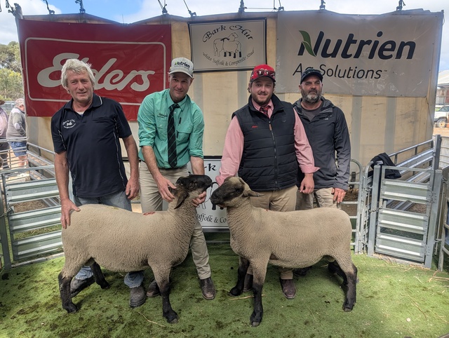 Bark Hut’s Justin Holman with Nutrien stock agent Matt Foster, Elders stock agent Tyson Fechner and Brad Willson from Blue Gum at Penneshaw with his two priced Composites at $3200 each. (Stan Gorton: 508124)