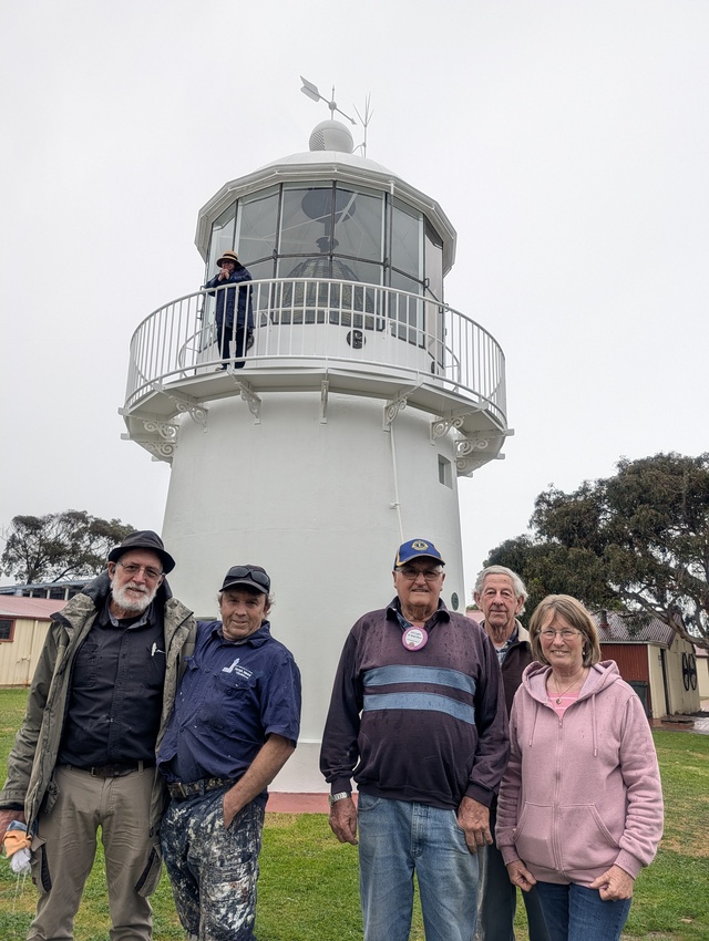 Lighthouse restorers Aubrey Strydom and Mark “Cecil” Sheriff with Hope Cottage National Trust Museum committee members Stuart Boxer, Kym Scholz and Lesley Walker in front of the newly restored Cape Willoughby light. (Stan Gorton: 509067)