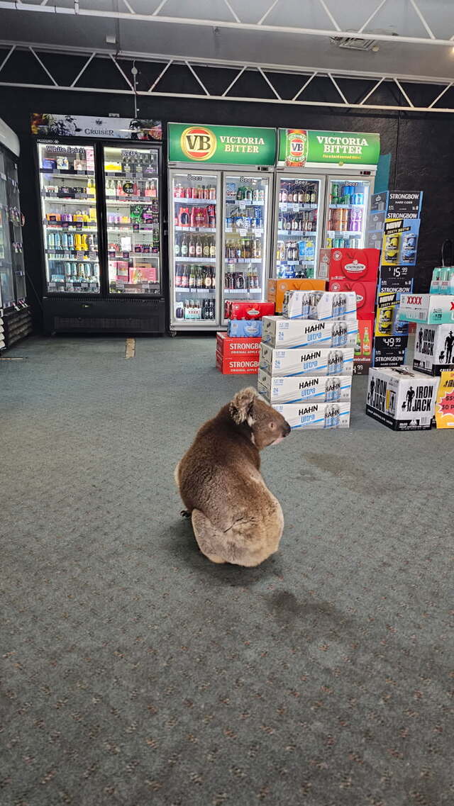 A koala walked into the Queenie bottle shop on Wednesday, browsing the drinks on offer. (Pierre Gregor)