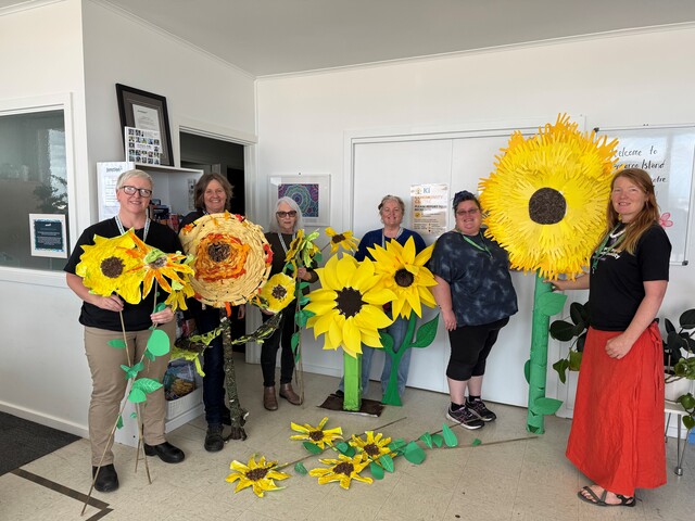 Pictured with sunflowers of all sizes are Clare Whiffen, Bec Davis, Anne Hamly and Maree Baldwin from Junction, hidden disability advocate Chelsea Schaefer, and Lil Walsh from Purple Orange. (Supplied)