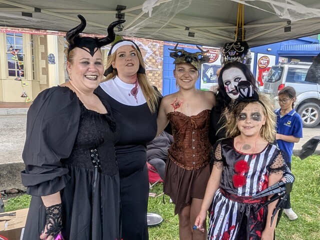 Handing out the treats at the Queenie Halloween Party on Friday afternoon were Shalina Rhodes, Oakley Osborne, Shavonne Rhodes, Celisha Rhodes and Jade Zinnack. (Stan Gorton: 514961)
