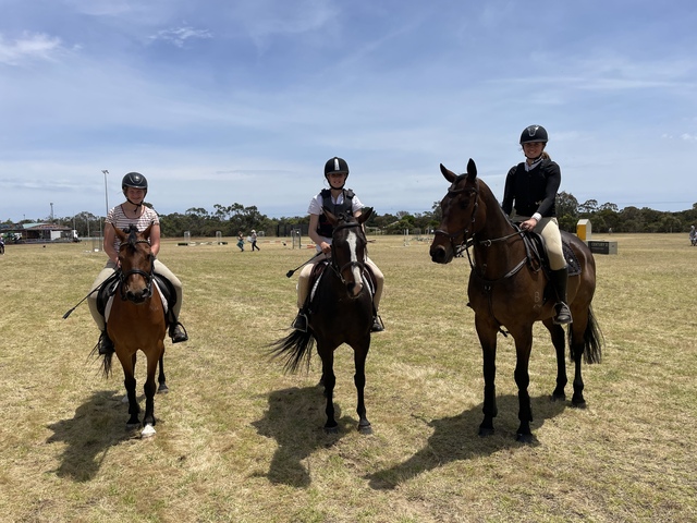 Olivia Harkness on Bing, Teila Baker on Mustang, and Sienna Donaghy on Walter before the equestrian events at last year's Parndana Show. (Stan Gorton: 445501_01)
