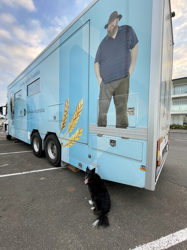 Twig the KI collie at the Mobile Service Centres truck on the Kingscote Esplanade during one of its previous visits to Kangaroo Island. (Stan Gorton: 515620)
