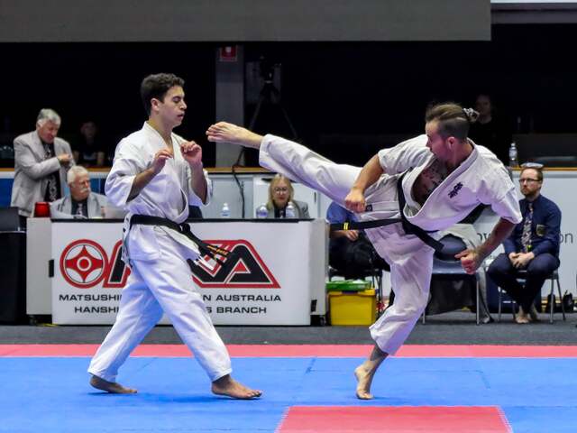 Senpai David Taylor in action delivering a roundhouse kick, qualifying in the Victorian Championships back in April. (Supplied)