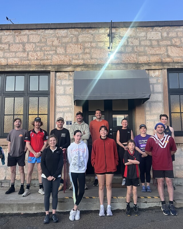 KI Run Club members gather at the Pick and Shovel wine bar for one of their regular Kingscote runs. (Supplied)