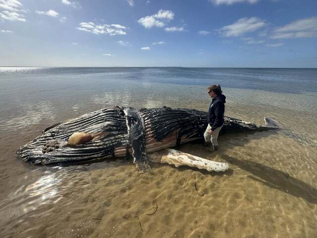 Research and Discovery Coastal Tours’s Ro Horbelt on December 15 with the young male humpback whale that washed up on the shores of Nepean Bay. (RAD KI Facebook)