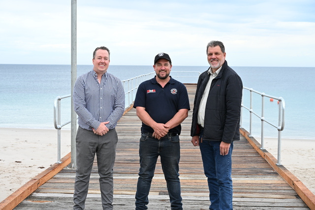 District Council of Yankalilla chief executive officer Nathan Cunningham, Southern Marine Resources operations manager Shaun Willamson, and mayor Darryl Houston on the repaired jetty. (Supplied)