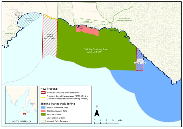 The western extension of Seal Bay Sanctuary Zone goes to the edge of Vivonne Bay harbour, with a beach fishing zone, while the eastern expansion is smaller. (yoursay.sa.gov.au/southern-ki-marine-park)
