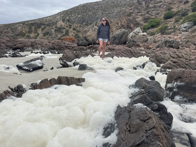 Roanna Horbelt from Research and Discovery Coastal Tours Kangaroo Island (RAD KI) was devastated to see more foam associated with the algal bloom over Christmas at Stokes Bay. (RAD KI Facebook page)