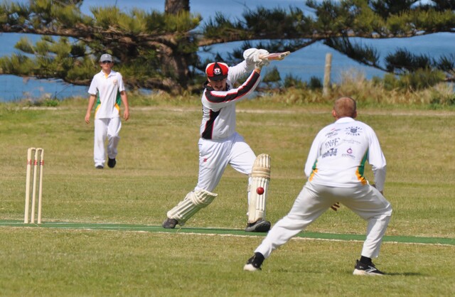 Western Districts batter Jack Hinton hits the ball with precision, but a fielder is ready to collect it. (Leasha Sanigar)